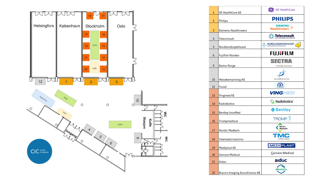 Det vil være totalt 22 stands fordelt på 3 gull, 9 sølv og 10 bronse. I tillegg vil det være buffet x 3 med pausemat og tapas-lunsj, plassert strategisk rundt utstillingsområdet og vegg i vegg med den store konferansesalen.